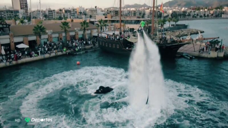 Las aguas del puerto de Mazarrón, en Murcia, han sido el escenario de la Copa del Rey de Flyski, un nuevo deporte acuático en la que los participantes se elevan varios metros por encima del agua propulsados por un chorro de agua.