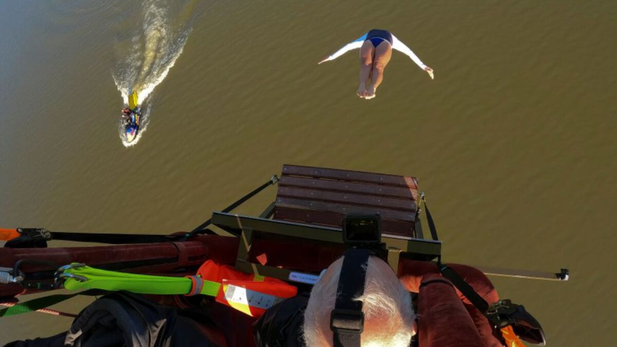 Lo que ha hecho la clavadista Rhiannan ha sido algo increíble: el primer clavado de la historia desde un globo en movimiento. Lo ha hecho una mujer, toda una campeona, que ha saltado al agua desde 18 metros de altura.