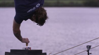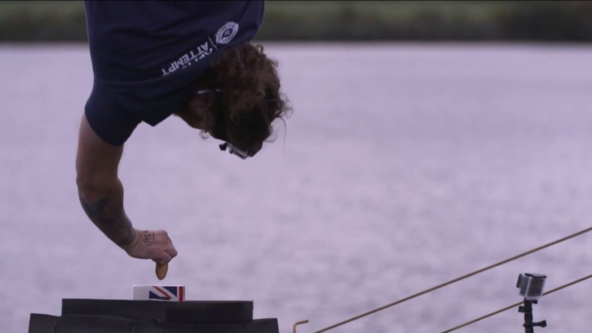 Lo primero esa buscar el escenario ideal para el reto, tenía que ser un lago, porque a Simon Berry, el mar, que habría sido ideal, le pillaba un poco lejos de su Sheffield natal, a más de 100 kilómetros. Luego encontrar una grúa para subirse a una altura equivalente a un edificio de 25 plantas. A partir de ahí ya era entrenar, algo muy complicado, porque la valentía se presupone, de lo contrario no hay récord, pero acertar con una galleta en una taza de ocho centímetros de diámetro era una misión casi imposible.
