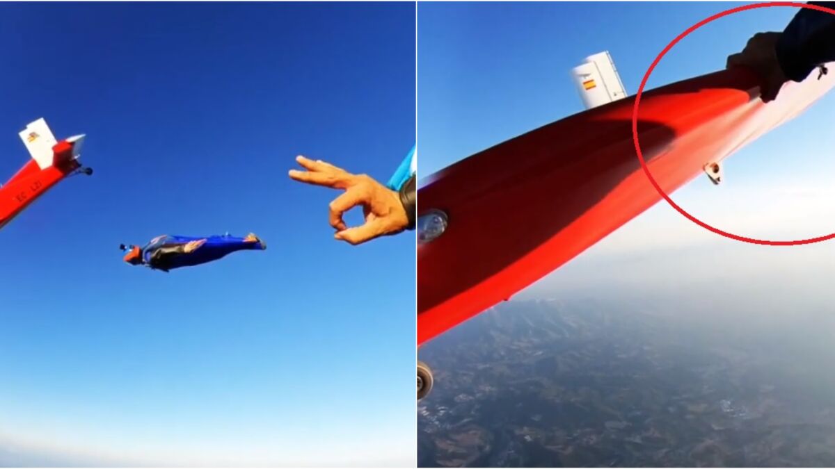 El experto paracaidista Sebastián Álvarez realizó una proeza de destreza y control volando junto a una avioneta, que llegó a tocar, en un vuelo con 'wingsuit' en Cataluña.