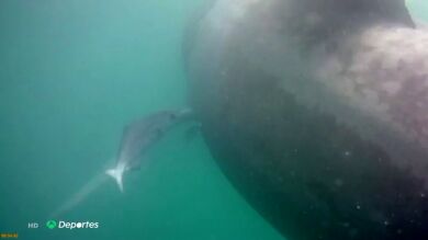 Un enorme tiburón peregrino ha aparecido en una playa de Granada, para sorpresa de los allí presentes. Antena 3 Deportes ha hablado con Alejandro, quien se encontró con el animal.