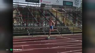Este antiguo atleta hace unos saltos de récord. La clave de estos de estos brincos está en sus tobillos, que le permiten usar sus piernas como si fueran muelles. Esto se debe a que ejerce una fuerza contra el suelo, que le devuelve como si de una especie de muelle se tratara.