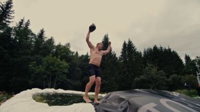 Cómo catapultarse a 30 metros de distancia dentro de un lago no les basta, por ello han decidido probar en una piscina. "Decidimos hacer una prueba de tiro, solo por seguridad", explica.