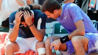 Nico Almagro tuvo que retirarse de Roland Garros tras sufrir la misma lesión que hace dos semanas en Roma. Del Potro, que conoce de primera mano lo que se sufre con este tipo de lesiones, se acercó a consolar al tenista español.