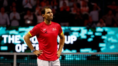 Rafa Nadaldijo adiós anoche de forma definitiva en el Martín Carpena de Málaga, una despedida que llegó tras la eliminación de España ante Países Bajos en los cuartos de final de la Copa Davis. El ya extenista manacorí se mostró muy emocionado y agradeció a todos los aficionados, compañeros y rivales su apoyo.