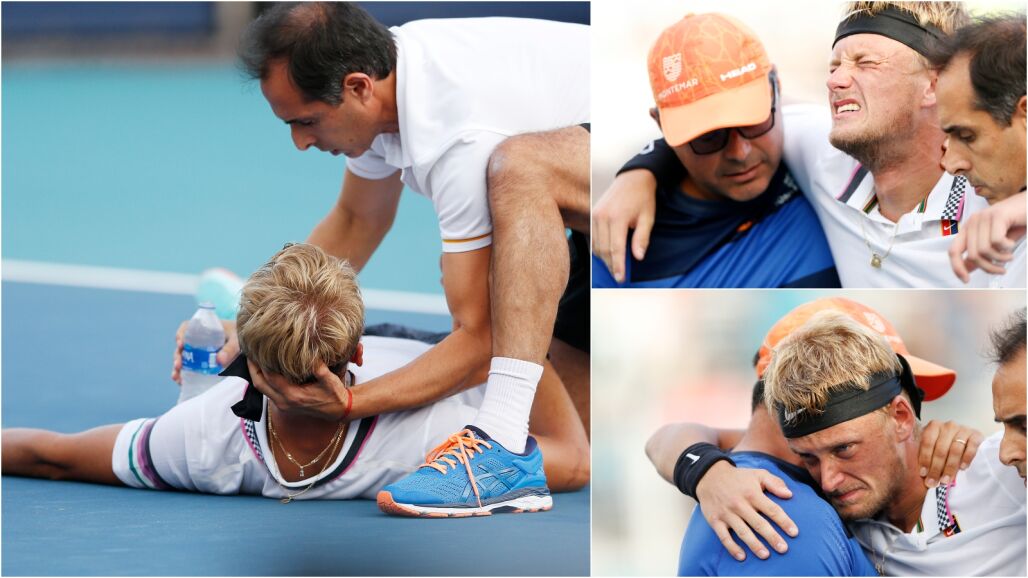 El tenista español nacido en Austria Nicola Kuhn dio el gran susto en el Abierto de Miami al colapsar y caer desplomado en mitad de su partido ante el alemán Mischa Zverev con terribles calambres.
