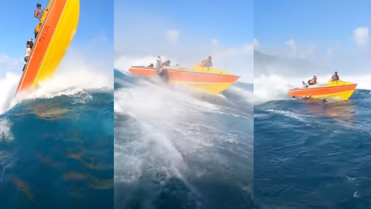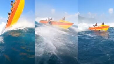 La ola, como puede verse en el vídeo que acompaña a este texto, pone la embarcación vertical, a pocos grados de volcar hacia atrás. Varios de los que iban en la misma llegan a caer al agua. Por suerte las motos de agua aparecen al segundo para rescatar a los caídos.