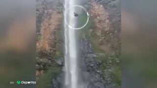 Un salto de 60 metros al vacío en una cascada, con una cuerda, pero algo falla. La caída es brutal, pero por centímetros, los dos protagonistas logran salvar la vida.