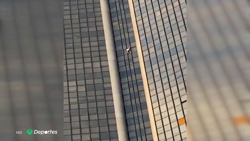 Una locura total que, además, afronta sin arnés ni equipo de seguridad. Ni siquiera lleva zapatillas. Sube a pulso los 210 metros de este edificio, ataviado con una camiseta y un pantalón corto.