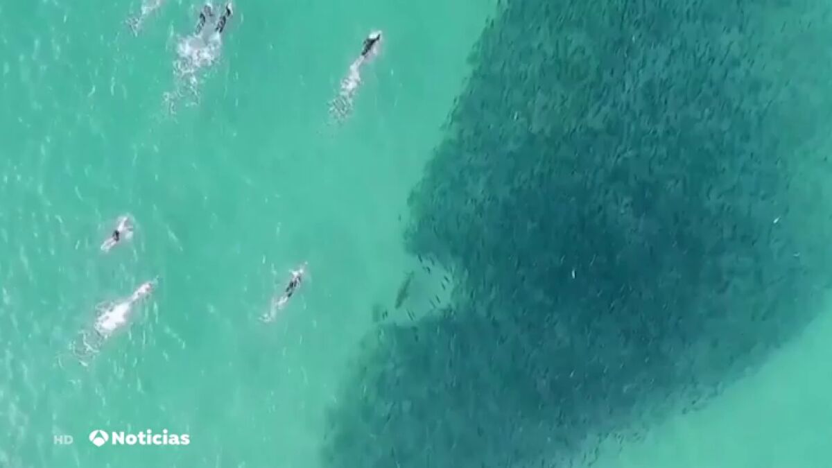 En las imágenes es posible ver a los escualos alimentándose en un gran banco de peces, no muy lejos de la costa. Mientras, las personas en el agua se acercan a los animales sin darse cuenta.