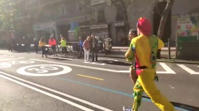 Vestido de payaso hacia la meta de la Maratón de Madrid por un fin solidario