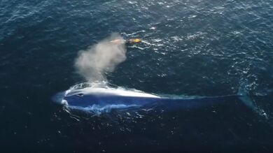 El paddler Rich German se grabó con un dron mientras surfeaba junto a una ballena azul de 24 metros en las aguas de Laguna Beach, San Clemente (California).