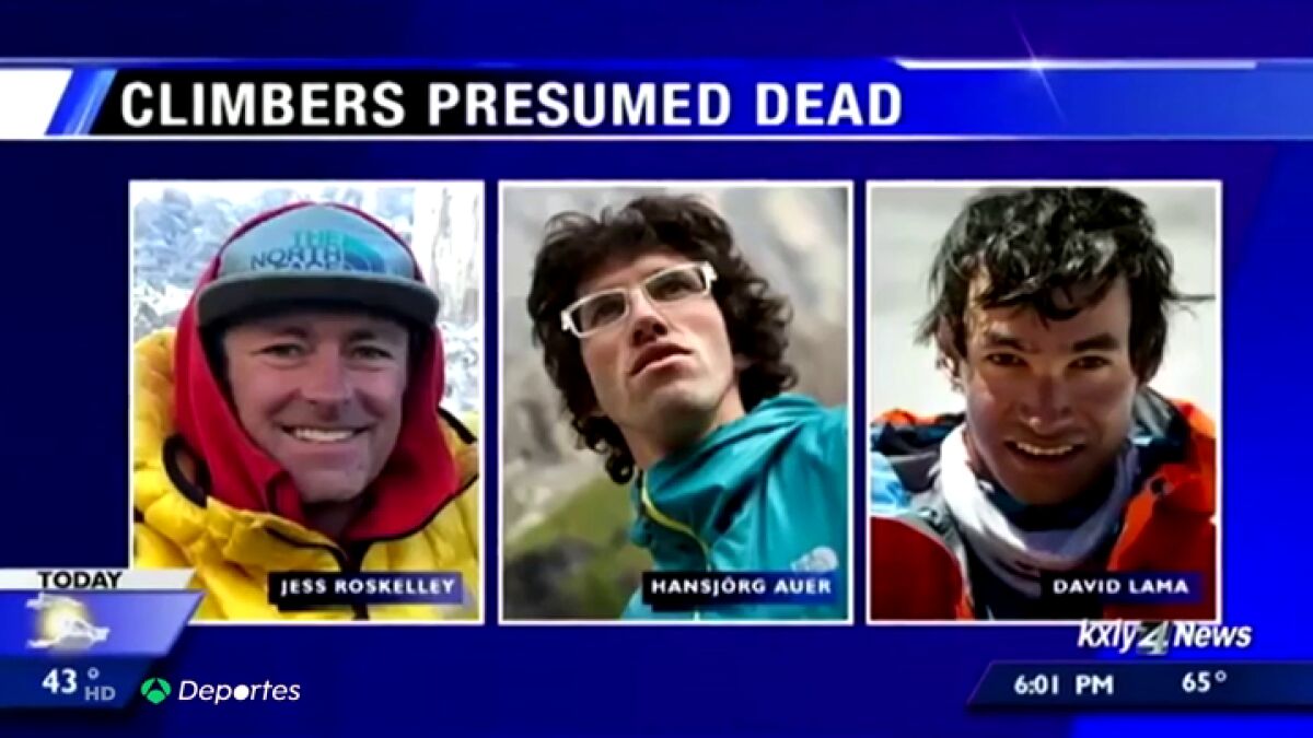 Los alpinistas Hansjörg Auer, David Lama y Jess Roskelley, tres de los mejores escaladores de los últimos años, están desaparecidos desde el miércoles al ser atrapados por una avalancha en las montañas rocosas de Howse Peak (Canadá), en unas condiciones que dan por imposible encontrarles con vida.