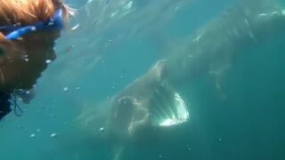 Un grupo de surfistas se toparon con un grupo de hasta veinte tiburones peregrinos gigantes y se pusieron a bucear junto a ellos.