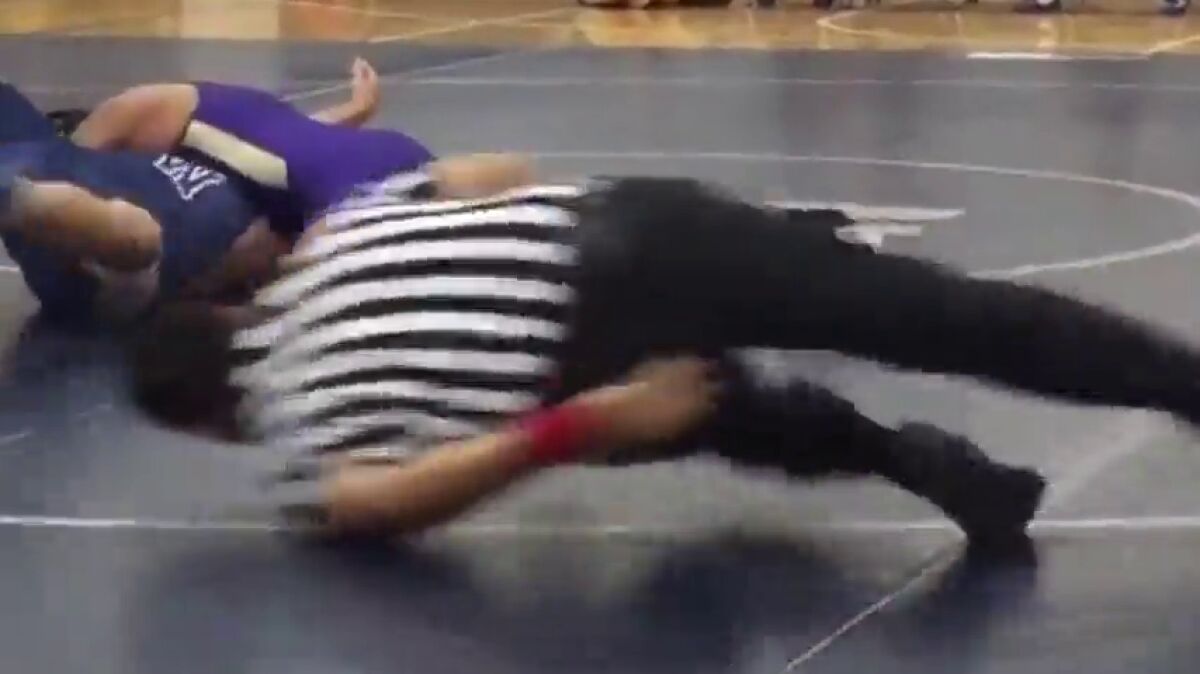 Un árbitro de lucha libre ha desafiado las leyes de la gravedad con un espectacular movimiento en una competición juvenil en Texas. Un aficionado captó el momento, que se ha vuelto viral y ha dejado boquiabiertos a los usuarios de las redes.