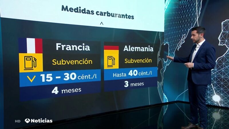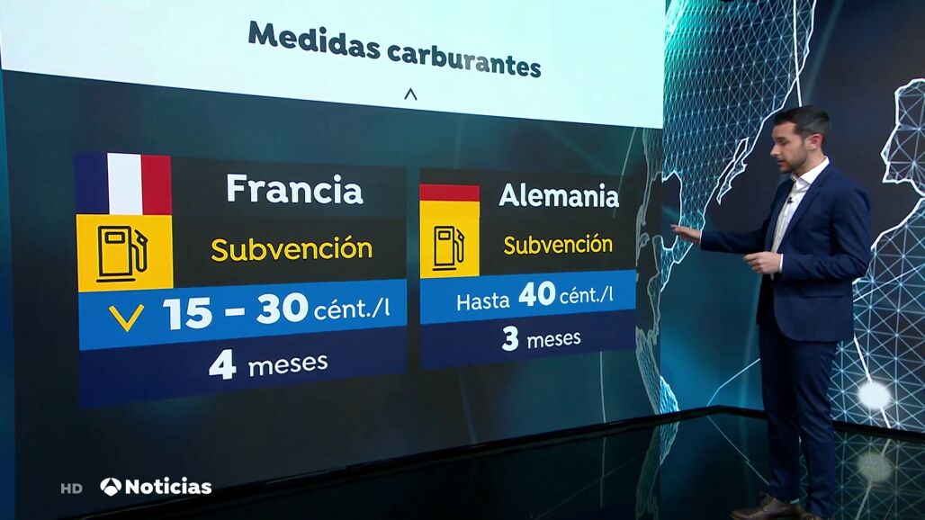 La principal medida de Francia entrará en vigor el 1 de abril, igual que en nuestro país. De hecho es el modelo en el que se ha inspirado el Gobierno de Sánchez para desbloquear la situación con el sector. En Francia, sin embargo, el descuento de 15 céntimos por litro -para cualquier tipo de combustible- se aplicará a todos los consumidores. Los franceses se ahorrarán así 9 euros por depósito.