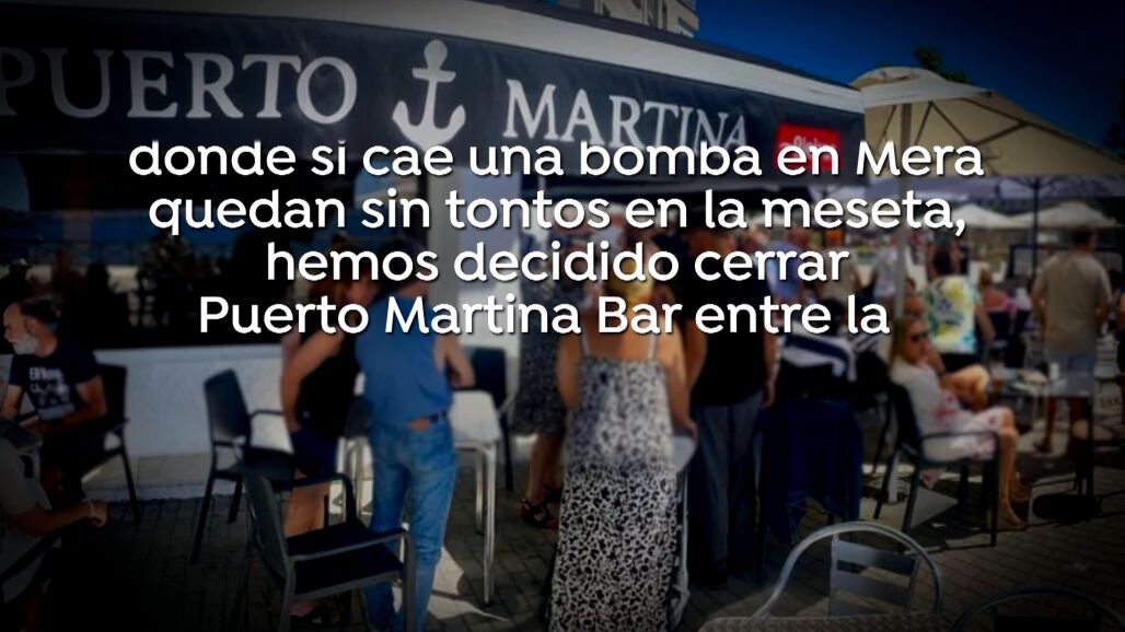 "Después de la última oleada de expresiones tales como: me pones 2 Barcelós cola y 4 vasos. Tendrás un pincho de tortilla para acompañar con el café, que solo no me entra. Aparte de macarrones con carne y empanada de pulpo tendrás otros pinchos, ya que soy celiaca y eso no lo puedo comer. Y ante la inminente llegada del puente del 15 de agosto, donde si cae una bomba en Mera quedan sin tontos en la meseta, hemos decidido cerrar Puerto Martina Baar entre las fechas 12 y 19 de agosto. Como dijimos anteriormente, estamos cansados de la prepotencia que atesora esta gente y no queremos desvirtuar el proyecto inicial para lo que fue concebido. Disculpad las molestias y esperemos que a partir del día 20 este algo más liberado el panorama”. Así ha sido el mensaje expuesto por el bar en su perfil profesional de Facebook.