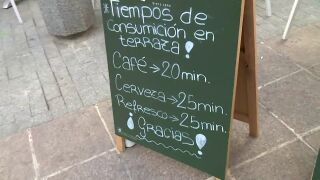 Cada minuto cuenta. En esta terraza valenciana -como en la vida- el paso del tiempo tiene un valor. Aquí, lo hace evidente un mensaje: "20 minutos un café, 25 un refresco". Grabado a tiza en una pequeña pizarra este negocio avisa, un euro cincuenta ya no vale "todo el tiempo del mundo".