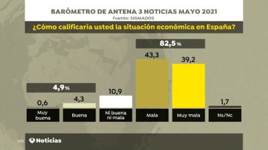 Tras más de un año de pandemia del coronavirus la gran mayoría de españoles se muestran pesimistas sobre la situación económica del país. Según el barómetro de 'Sigma Dos' para Antena 3 Noticias, más del 82% la considera mala o muy mala, frente a apenas un 5% que la considera buena o muy buena.