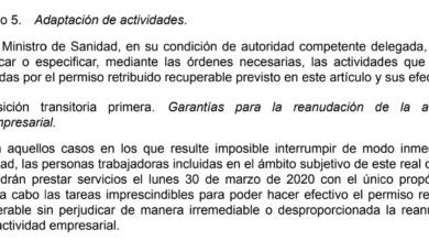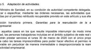 También establece que las empresas que deban aplicar el permiso retribuido recuperable podrán, en caso de ser necesario, establecer el número mínimo de plantilla o los turnos de trabajo estrictamente imprescindibles con el fin de mantener la actividad indispensable durante el estado de alarma en España por el cotonavirus: "Esta actividad y este mínimo de plantilla o turnos tendrá como referencia la mantenida en un fin de semana ordinario o en festivo".