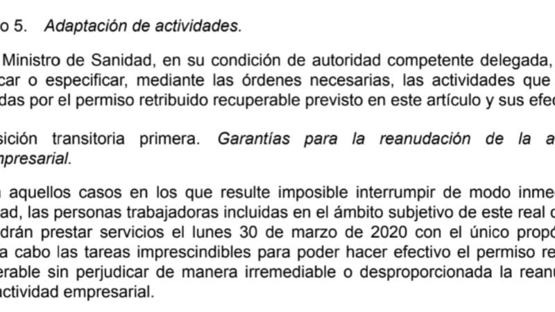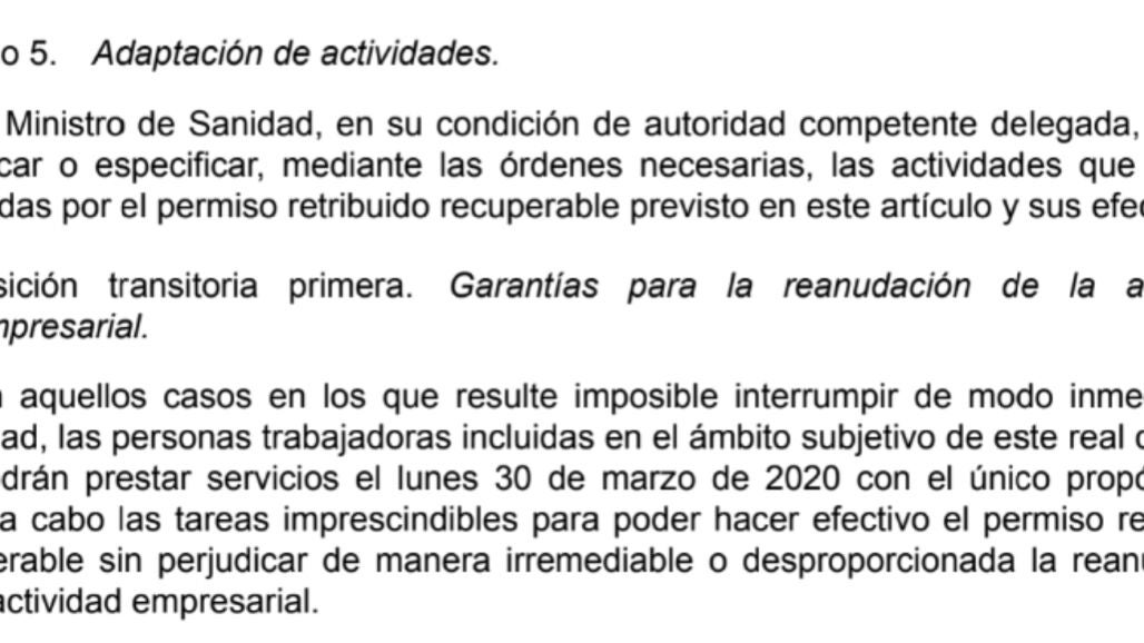 El único propósito de la moratoria de un día será "llevar a cabo las tareas imprescindibles para poder hacer efectivo el permiso retribuido recuperable sin perjudicar de manera irremediable o desproporcionada la reanudación de la actividad empresarial".