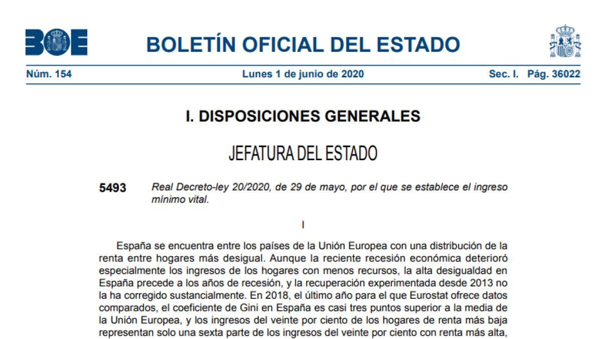 El Boletín Oficial del Estado publica los detalles del Ingreso Mínimo Vital que se pone hoy en marcha