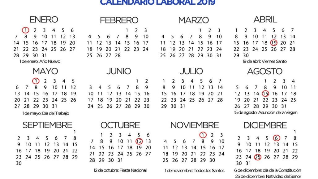 El año 2019 tendrá ocho días laborables que serán festivos y dos puentes nacionales, ya que tanto el 1 de noviembre, día de Todos los Santos, como el 6 de diciembre, día de la Constitución, caen en viernes. Según el calendario laboral elaborado por la Dirección General de Empleo y publicado por el Boletín Oficial del Estado (BOE), las ocho fiestas nacionales son: