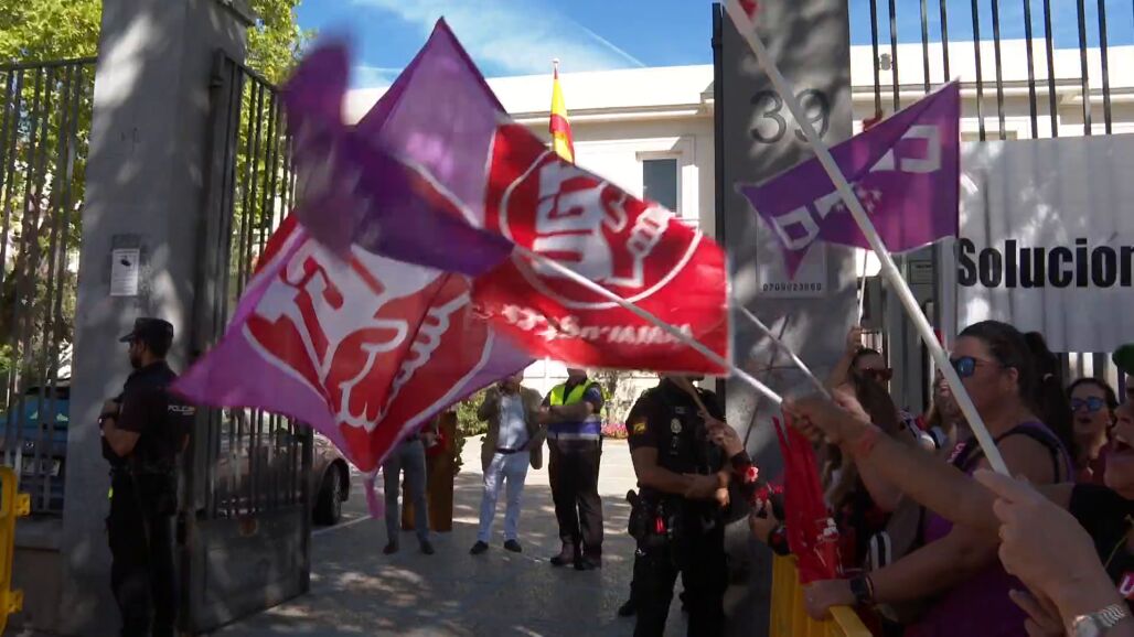 Los trabajadores externos del servicio telefónico de la Seguridad Social están este lunes en huelga. A escasos días de que su contrato dé por finalizado, y sin saber cuál será su futuro, se han concentrado frente al Ministerio de Seguridad Social con el apoyo de sindicatos como CCOO o GGT -este último, precisamente, es el sindicato que preside el comité de empresa-.