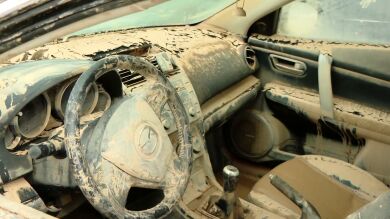 "Lo primero cuando nos acercamos a un coche afectado es averiguar hasta donde llegó el nivel del agua", dice mientras nos acercamos a un coche. "Se ve claramente como aquí el agua llegó hasta el coche" esto supone que se trata de un siniestro total. Si el agua supera el nivel de la palanca de cambios, se da por hecho que se han visto afectadas las centralitas y el sistema eléctrico. Estas son las averías más caras y supondría más dinero asumir el arreglo que el propio valor del coche.