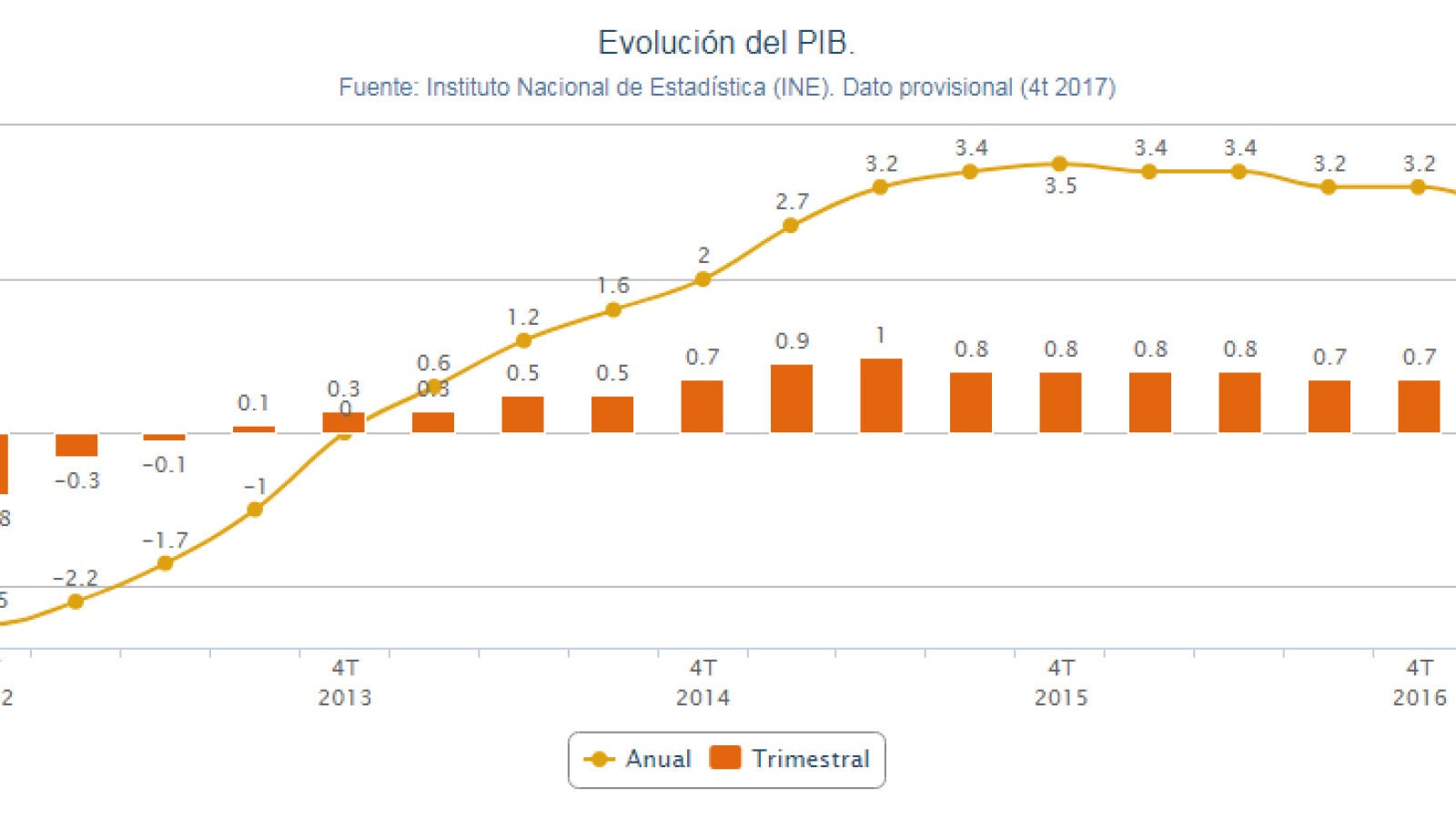 Solo entre octubre y diciembre la economía avanzó el 0,7 %, lo que supone una décima menos respecto al 0,8 % del trimestre anterior. El INE publicará el 1 de marzo el detalle de la contabilidad nacional, si bien la evolución de los tres primeros trimestres indica que el crecimiento económico de 2017 se ha sustentado en la demanda interna (consumo e inversión), aunque el sector exterior ha mantenido una contribución positiva al PIB.