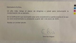 "Un año más, tengo el placer de dirigirme a usted para comunicarle la revalorización de su pensión. En la notificación que acompaña esta carta encontrará la cuantía exacta en la que se verá incrementada su prestación a partir del 1 de enero de 2026".