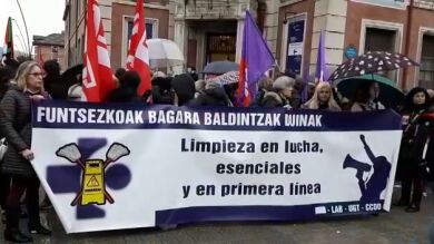 Los sindicatos exigen un convenio igual que cualquier otro trabajador del Servicio vasco de salud, Osakidetza. Más de 200 personas se han manifestado esta mañana por las calles de Bilbao bajo el lema "limpieza en lucha, esenciales y en primera línea". ELA, sindicato mayoritario en la mesa negociadora, con un 40% de representación, considera muy positiva la respuesta de las operarias en estos primeros días de paro en el que el seguimiento, aseguran "está siendo muy amplio" en toda la comunidad autónoma.