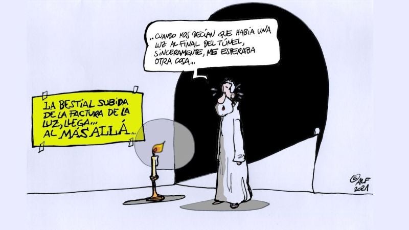Aun así, el dato de hoy es de 31,43 euros por debajo del récord histórico que alcanzó el jueves (188,18 euros). "Cuando nos decían que había una luz al final del túnel, sinceramente, me esperaba otra cosa...", así refleja Alfredo Boto la desorbitada subida de la factura de la luz en su viñeta gráfica de la semana.