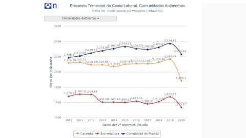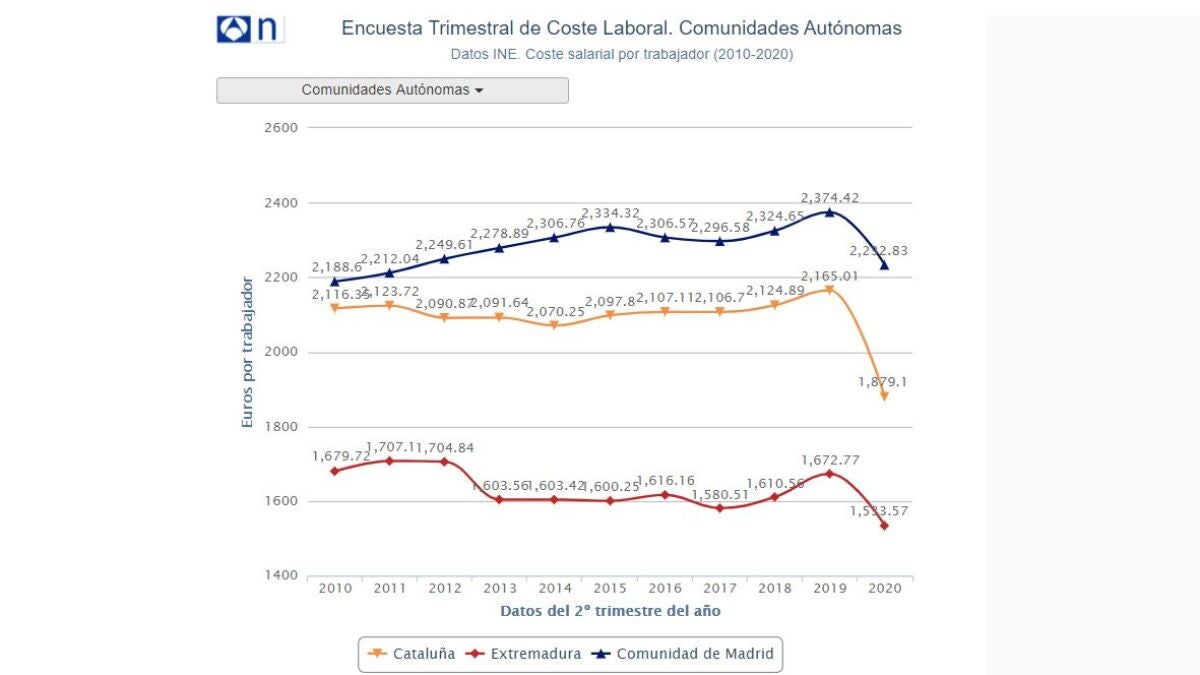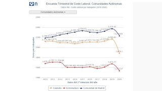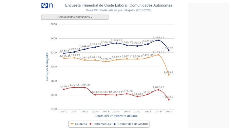 Por comunidades autónomas, el coste laboral en Comunidad de Madrid y País Vasco superó en más de 400 euros la media nacional. En Canarias e Islas Baleares dicho coste fue inferior a la media en la misma cantidad. En variación anual, el coste laboral descendió en todas las comunidades autónomas. Comunidad Foral de Navarra, Región de Murcia y Comunidad de Madrid presentaron los menores descensos. Por el contrario, Islas Baleares, Canarias y Cataluña registraron las mayores bajadas.
