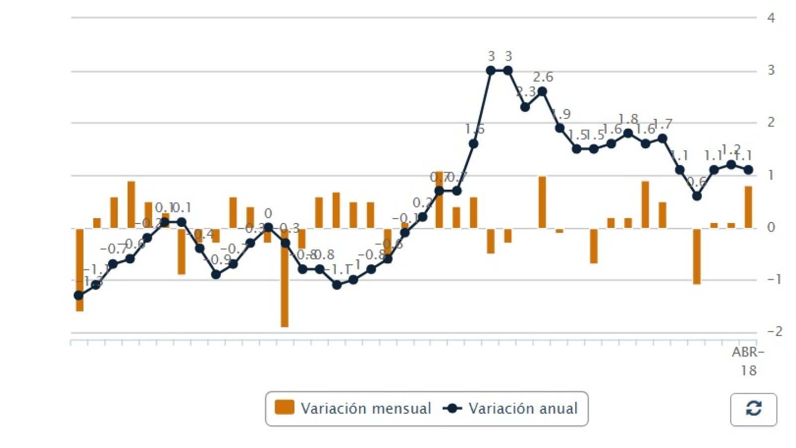 Tras haber registrado en enero una tasa interanual del 0,6%, la más baja en 16 meses, el IPC interanual volvió en febrero a superar el 1%, tendencia que se ha mantenido en marzo y abril. La inflación subyacente, que no incluye los precios de los productos energéticos ni de los alimentos no elaborados, bajó cuatro décimas en abril, hasta el 0,8%, con lo que se sitúa tres décimas por debajo del IPC general.