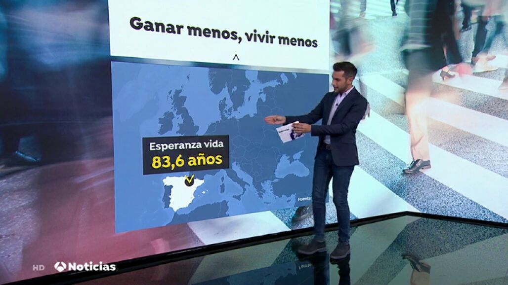 La esperanza de vida en España es una de las más altas de Europa 83 años y medio, según la Organización Mundial de la Salud, OMS. Por encima de Francia 82,27 años y el reino Unido 80,96. Sin embargo las personas con menos recursos vive 2 años y medio menos.