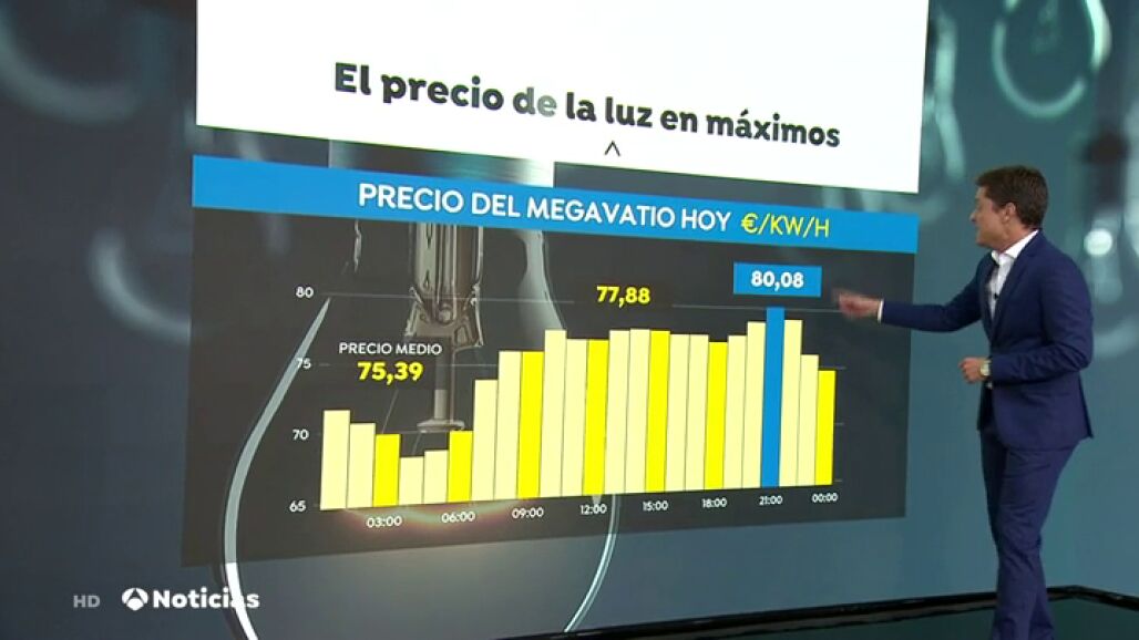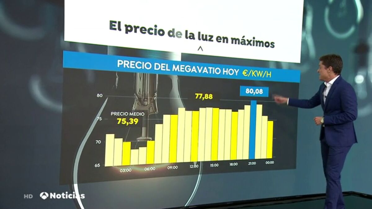 Ya sea por la falta de lluvias o por la falta de carbón, el resultado es el mismo. El megavatio/hora supera la barrera de media de los 75 euros. A las 15:00h supera incluso los 77 euros y a las 21:00 marca un nuevo récord con una subida de precio de más de ochenta euros.