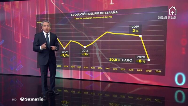 En 2006, la economía española crecía al 4% anual y la crisis posterior nos llevó a una caída del 3,7% en 2009, y a una recaída de un 3% en 2012. El año pasado crecimos un 2%, y ahora nos precipitamos hacia un -8%.
