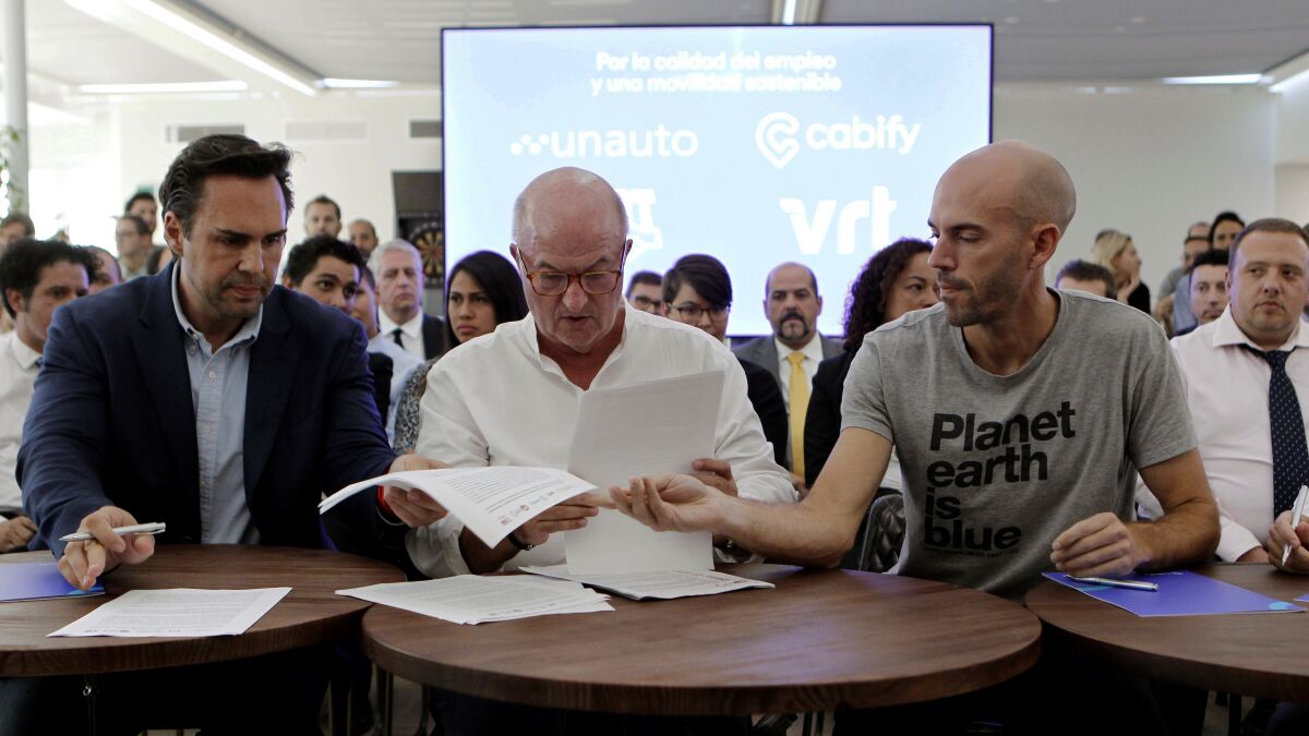 El acuerdo ha sido firmado por el presidente de la patronal del sector Unauto, Eduardo Martín, y los primeros ejecutivos de Cabify y Vector, Juan de Antonio y Rosauro Varo, además de por el secretario general de la Federación de Servicios para la Movilidad y el Consumo de UGT, Miguel Angel Cilleros.