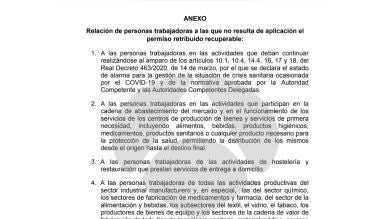 Recordamos que todas estas actividades son esenciales por lo que serán todos los trabajadores cuyas actividades no estén en esta lista quienes tendrán que acogerse a la medida anunciada por el presidente del Gobierno y no ir a trabajar durante las dos próximas semanas, aunque seguirán percibiendo su retribución normal y tendrán que recuperar los días más adelante.