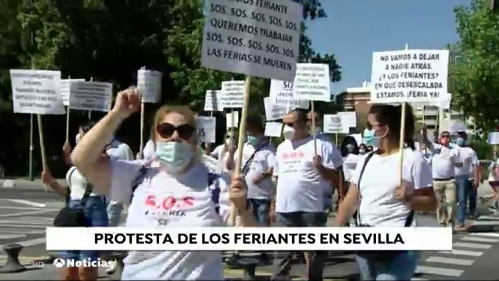 Al grito de'La feria se muere, queremos trabajar', los feriantes han recorrido las calles de la ciudad hispalense portando numerosos carteles y pidiendo ayudas urgentes para el sector: “Nosotros no tenemos más ingresos que la feria y si nos quitan la feria, nos quitan todo”, asegura uno de ellos.