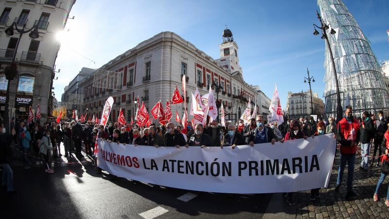 Miles de personas han marchado este domingo en Madrid por la sanidad pública y bajo el lema 'Salvemos la Atención Primaria'. Sanitarios y pacientes denuncian que los centros de salud son los "grandes olvidados" desde que comenzó la pandemia del coronavirus.