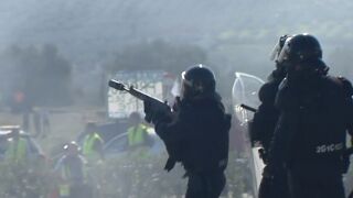 Los antidisturbios de la Guardia Civil ha desalojado a ungrupo de agricultores que han cortado la autovía. Se han vivido verdaderos momentos de tensión entre los agentes y los manifestantes.