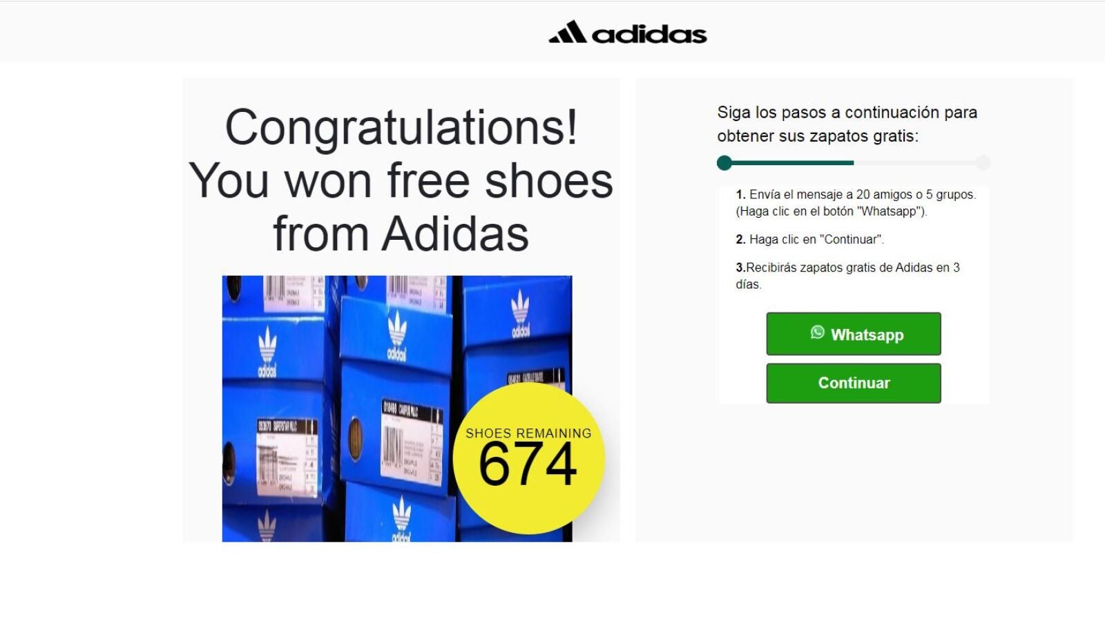 La página del sorteo no es una página oficial de Adidas e incluso el motivo del sorteo, que en muchas veces suele el centenario de la empresa, no es cierto. Adidas se fundó en 1949.