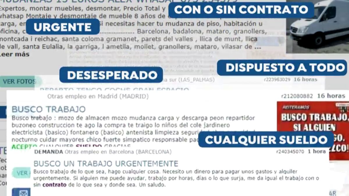 Son miles los anuncios publicados en Internet pidiendo un trabajo. Sin embargo, hay algo que llama la atención en ellos. Las palabras "dispuesto a todo" e incluso "yo pago" protagonizan esos anuncios. La desesperación de los ciudadanos va en aumento.