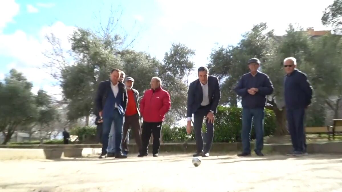 Sánchez juega a la petanca con un grupo de pensionistas reivindicando la subida de las pensiones aprobada por el Gobierno