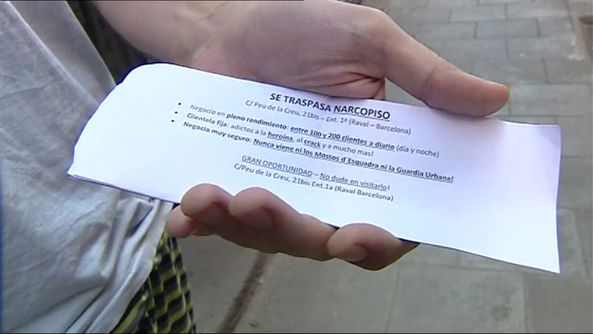 "Se traspasa narcopiso. Negocio en pleno rendimiento": es el anuncio puesto los propios vecinos del Raval. Están desesperados por el aumento de la venta de droga y la delincuencia. Denuncian que nunca vienen los Mossos ni la Guardia Urbana.