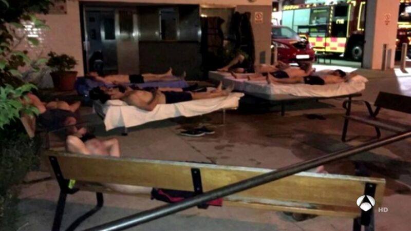 Los bomberos de Getafe han dormido en la calle. Aseguran que dentro de su edificio es imposible, porque el calor es insoportable. Al parecer, el aire acondicionado no funciona y la empresa que se encarga del mantenimiento no puede solucionar el problema. Ellos dicen que estaban a 38 grados dentro del cuartel.
