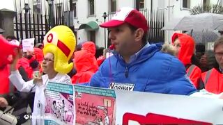 Los trabajadores de los puntos de atención primaria de la sanidad gallega se concentran frente al parlamento en Santiago de Compostela. Piden más personal y mejoras laborables convocando una huelga indefinida el 7 de enero.