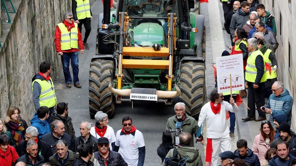 Antes de las 11:30 horas arrancaba la marcha en la Cuesta de Santo Domingo. En la cabecera una pancarta en la que se leía ''Sin agricultores y ganaderos ¿quién te dará de comer mañana?' y entre aplausos han puesto rumbo hasta la hornacina donde se coloca la figura de San Fermín durante los encierros de las fiestas de Pamplona.
